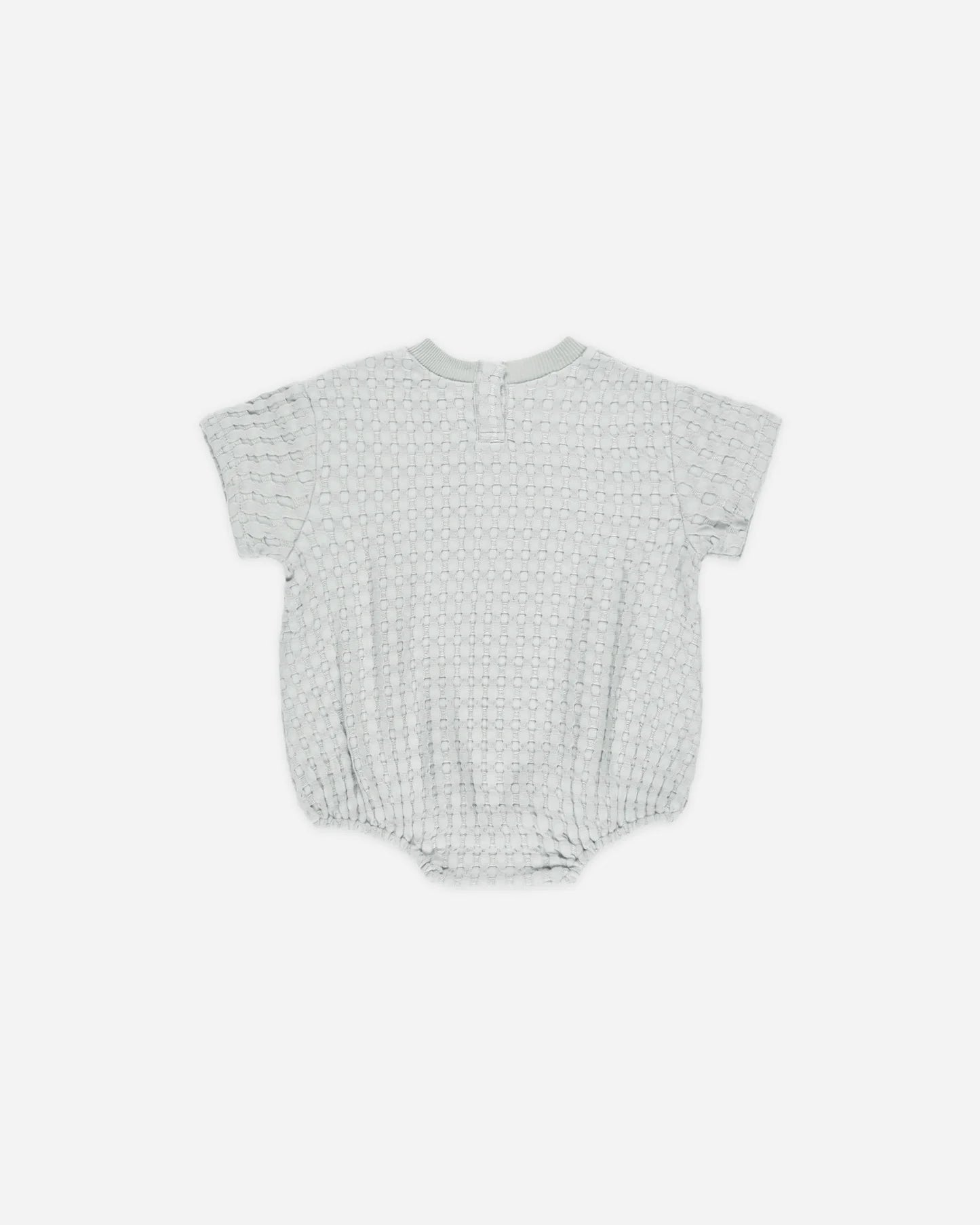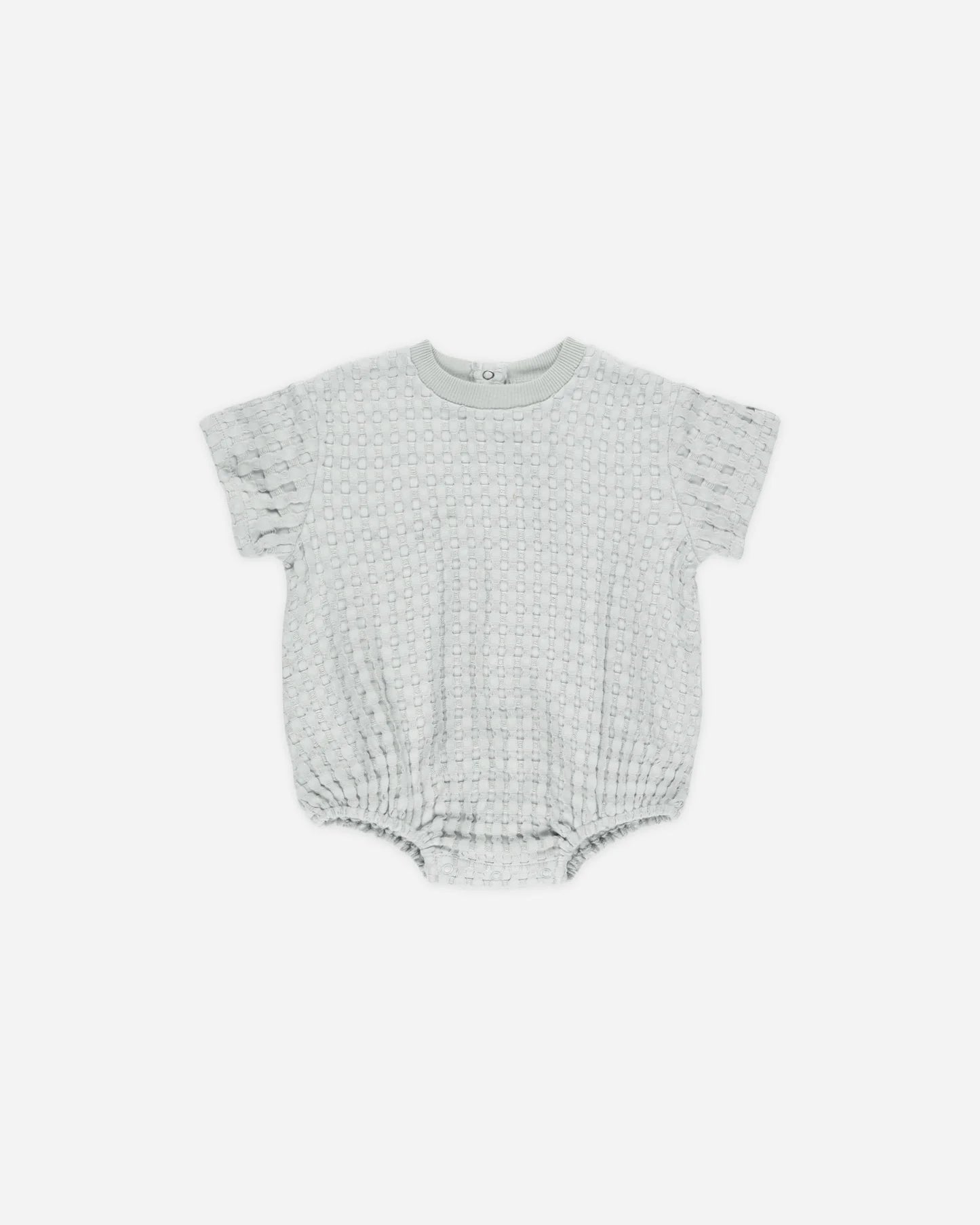 Short sleeve bubble romper in our chunky waffle bamboo cotton blend that will be a go-to this season! Featuring elastic leg openings, bottom snap closure, and back neck snaps for easy changing.