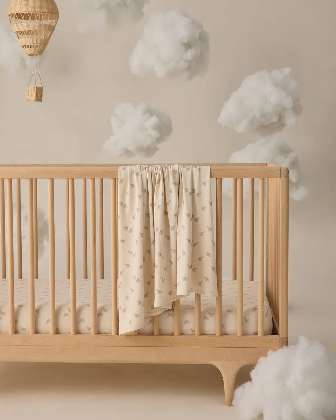 Featuring ‘elephants’ print on 'natural' hue. This darling print encapsulates vintage nursery feels.
