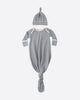 Knotted baby gown designed with fold over hand mitts, paired with a knotted baby hat in a stretchy rib knit.