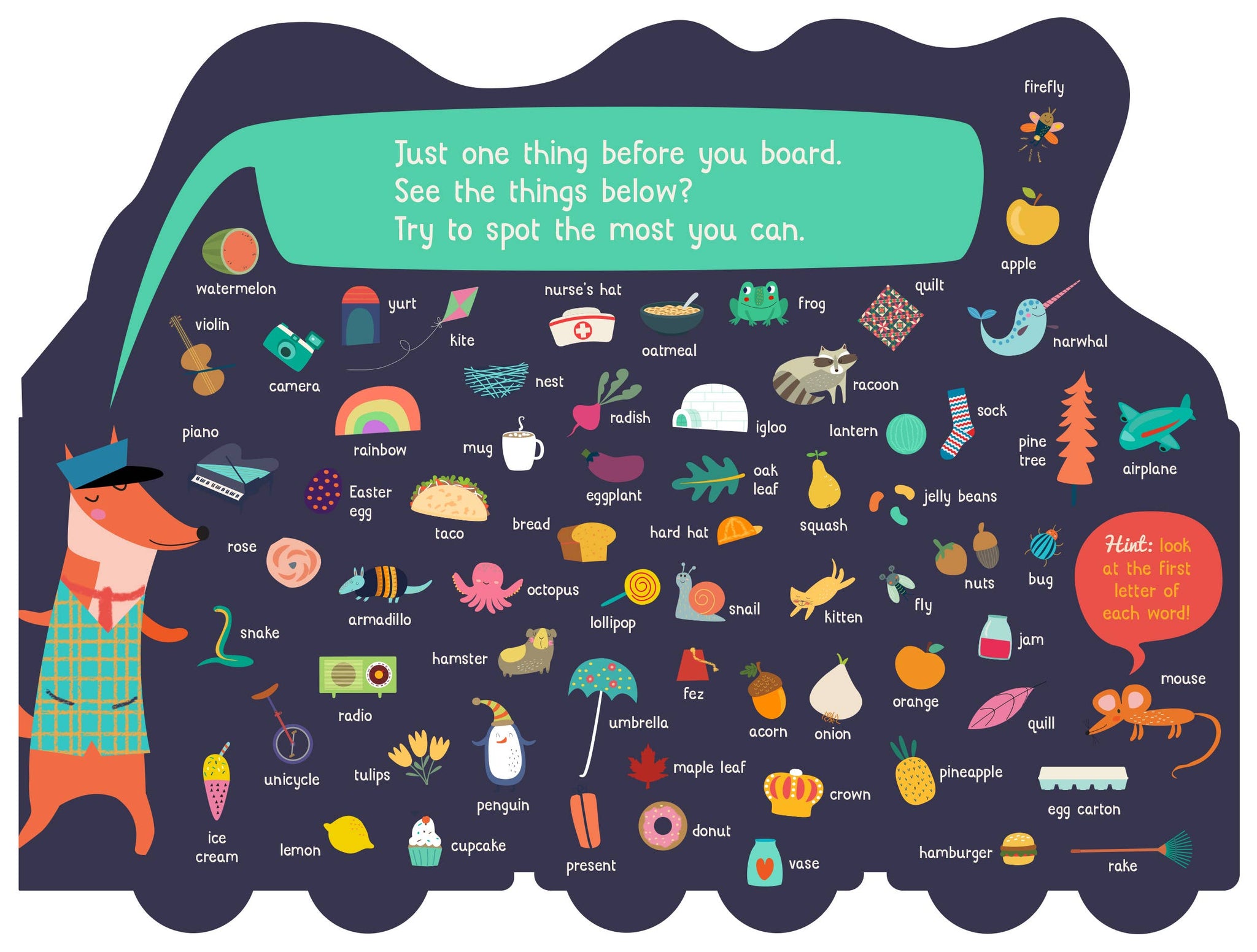 In addition to the animals, each whimsically designed train car includes fun objects for each letter: Bear eats a banana, Elephant listens to earphones, and Fox wears a fez (of course).
