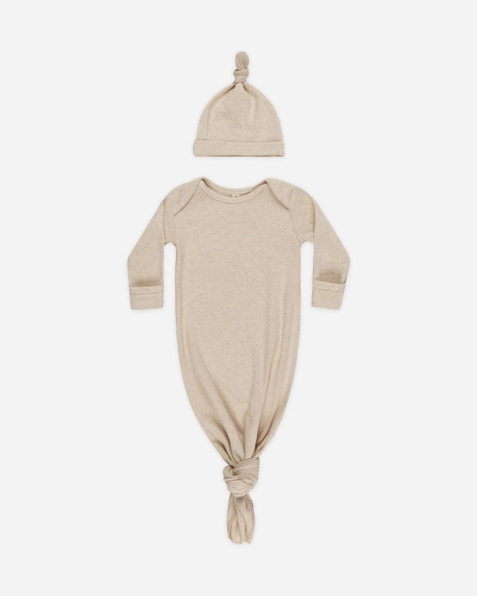 Self-tie Knotted Baby Gown designed with lap sleeves and fold-over hand mitts, paired with a knotted baby hat in a soft ribbed melange knit.