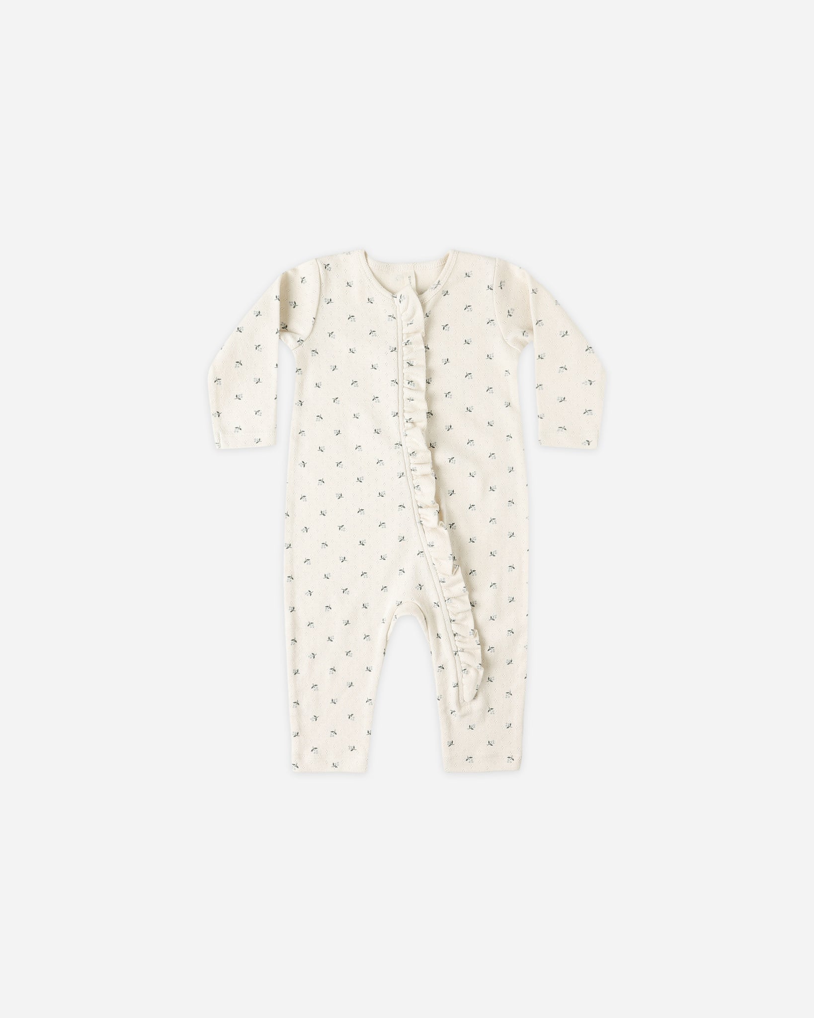This sweet pointelle jumpsuit features delicate ruffle detail along the zipper, combining cozy comfort with timeless charm.Featuring our 'blue ditsy' print on our 'natural' hue.Care: Machine wash cold. Tumble dry low.100% Organic Cotton