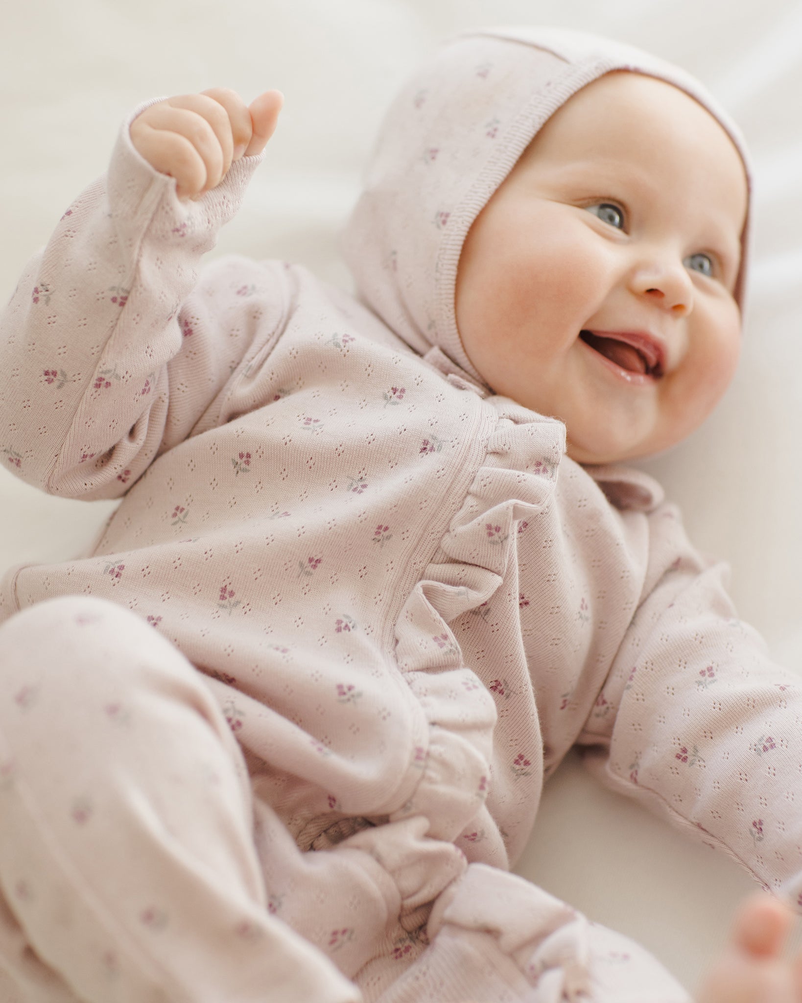This sweet pointelle jumpsuit features delicate ruffle detail along the zipper, combining cozy comfort with timeless charm.Featuring our 'lilac ditsy' print on our 'lilac' hue.Care: Machine wash cold. Tumble dry low.