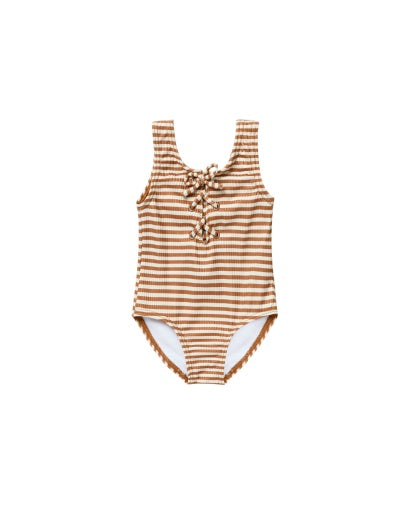 This one-piece swimsuit has a lace-up front and scoop-back in a fun ribbed fabric.