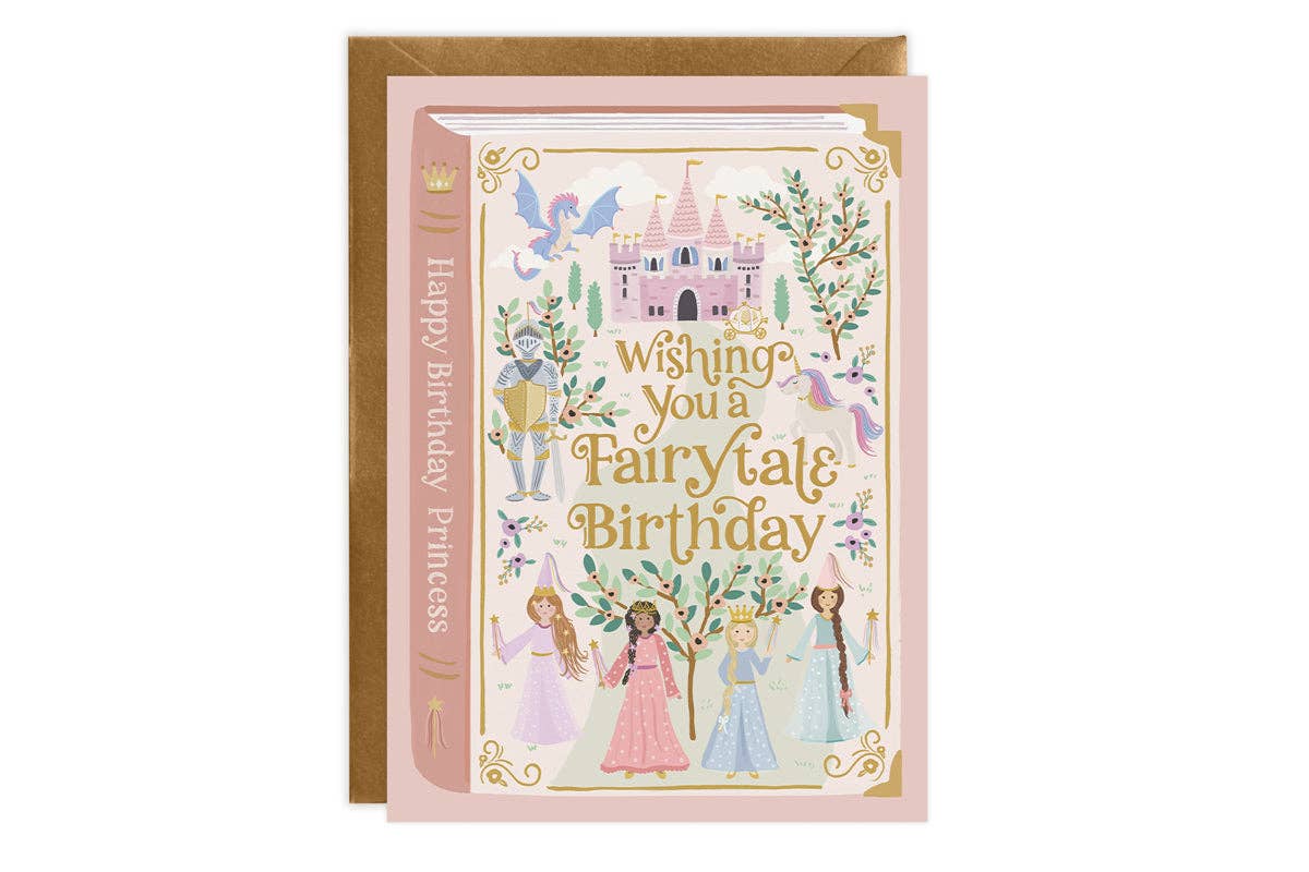 The perfect card for the birthday party princess! Like a fairytale book, this birthday card sends greetings of "Wishing You a Fairytale Birthday" and "Happy Birthday Princess!"