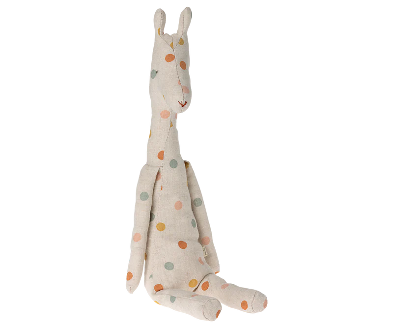 This giraffe comes in soft linen fabric with a multi-dot print. It has a sweet look and size - a new best friend for the small ones.