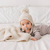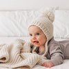 Lovingly hand-knit from natural hued yarn, this cozy bonnet secures under the chin and is finished with a fluffy pom-pom. It’s perfect for chilly days, makes a sweet baby gift, and doubles as a cute photo prop. Available in various colors, with matching sweaters and blankets to complete the look!