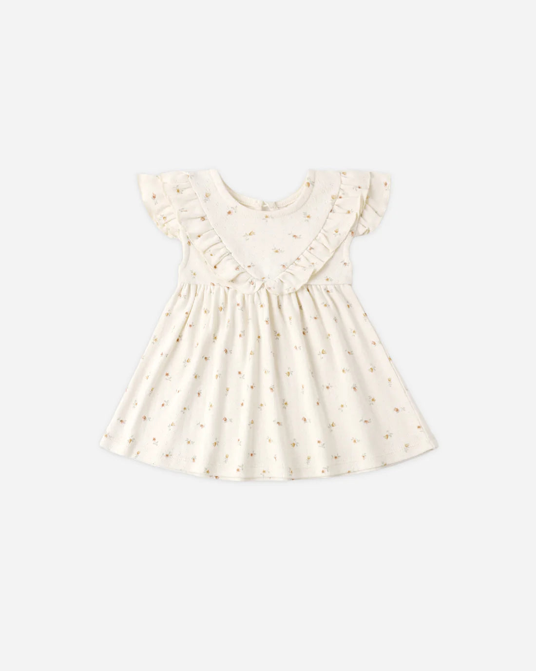 Flutter sleeve dress with sweet ruffle detail in our classic pointelle fabric. Button back closure for easy changing. Coordinating bloomers included with all sizes.