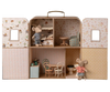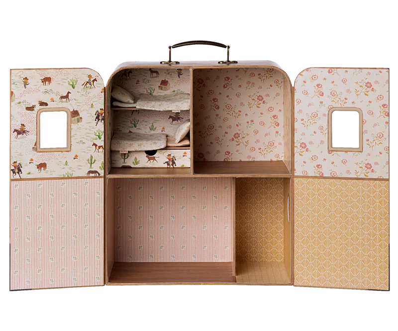 Welcome to the SuitCasa, a charming portable mouse house perfectly sized for Little Brother and Little Sister mice. With a convenient handle, it transforms into a suitcase when the magnetic doors are closed, making it easy to take your mice on adventures. Inside, two built-in beds with soft bedding provide a cosy place to sleep, and there is plenty of room to add small mouse-sized furniture and accessories to create a personalised, cosy home on the go.